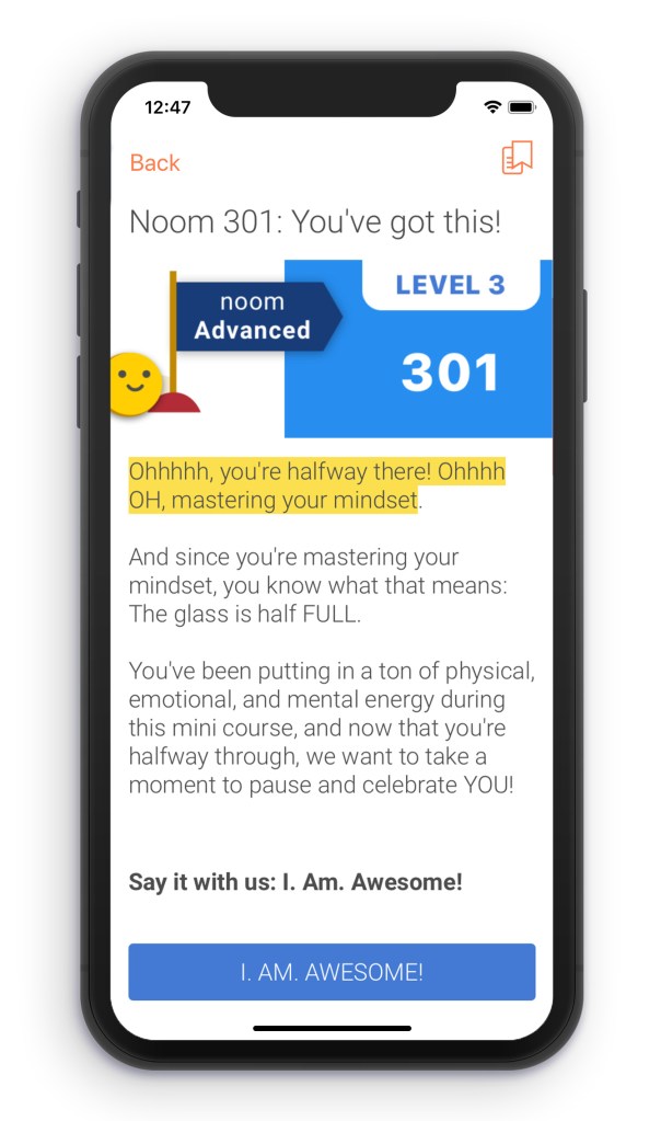 The articles, in the beginning, ease you into the whole process and explain what to expect. Some days, there are questions or commitments they want the user’s response. The writing tone is light, encouraging, and at times humorous, depending on the topic. Noom is also VFOA (Very Fond of Acronyms) and loves quizzes. They use both religiously throughout and make fun of themselves sometimes for it.